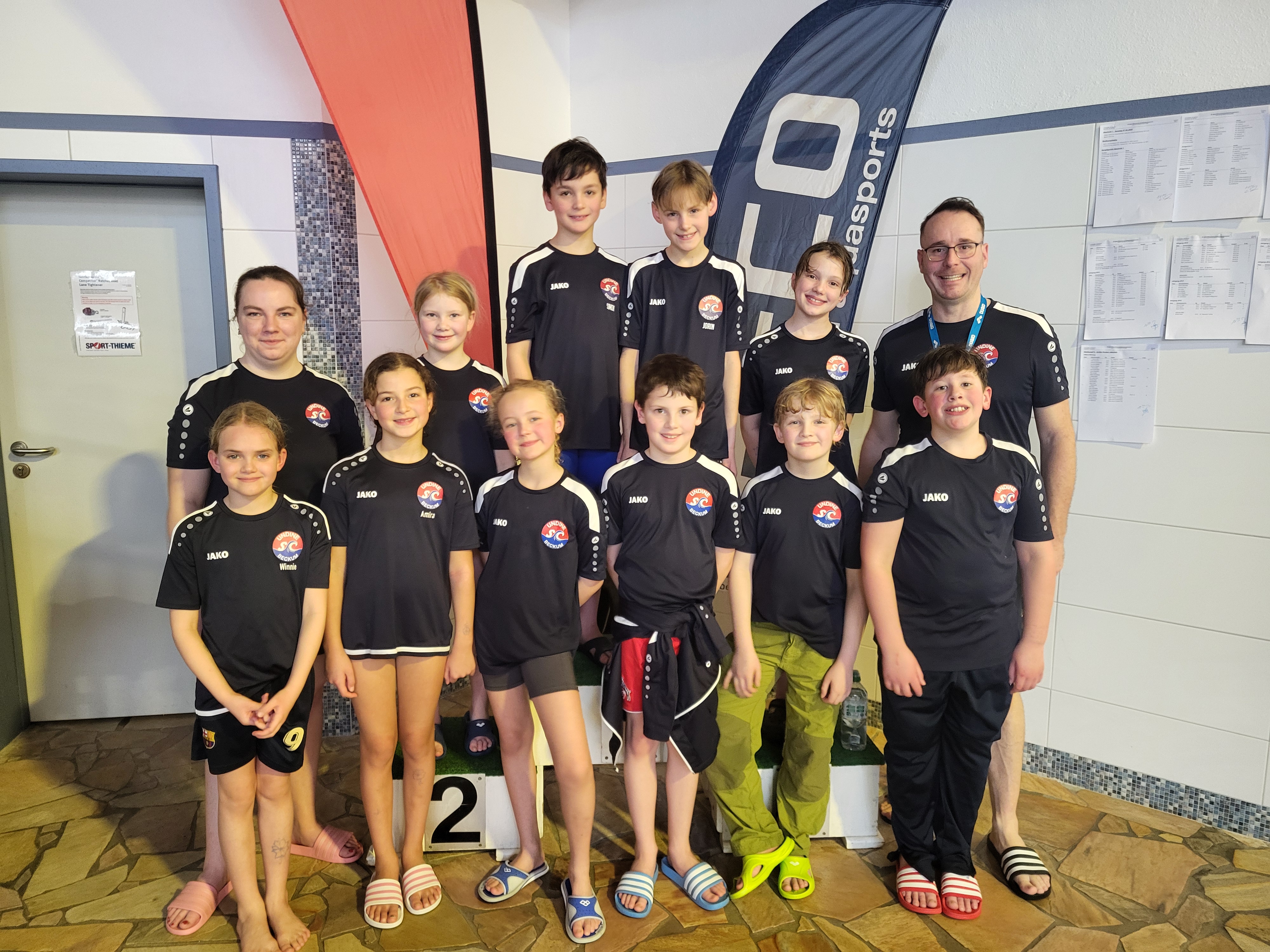 Im kindgerechten Wettkampfteil bewiesen die Allerjüngsten, dass sie schon wie die Großen zusammenhalten können. In zwei packenden Staffel-Entscheidungen schwammen die Beckumer der Konkurrenz davon und sicherten sich über 4x25m Freistil und 4x25m Rücken den ersten Platz auf dem Treppchen.